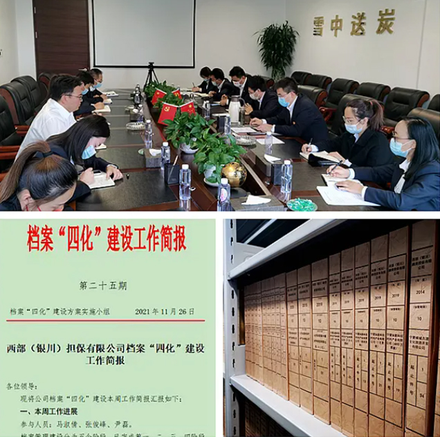 2021年初,公司制定下發(fā)了《西部(銀川)融資擔(dān)保有限公司檔案管理“四化”建設(shè)行動(dòng)方案》,成立了由班子成員、各部門(mén)負(fù)責(zé)人、檔案管理專員組成的檔案管理工作領(lǐng)導(dǎo)小組和實(shí)施小組,明確了檔案工作的各項(xiàng)目標(biāo)任務(wù),為全面開(kāi)展檔案資料的收集、整理、移交、歸檔等各項(xiàng)工作提供了分工明確、運(yùn)行高效的機(jī)制保障。截止目前,實(shí)施小組共撰寫(xiě)出具工作簡(jiǎn)報(bào)25期,組織集中工作討論會(huì)6次,修訂下發(fā)4項(xiàng)制度,共接收業(yè)務(wù)檔案330卷176筆,整理上架142卷。