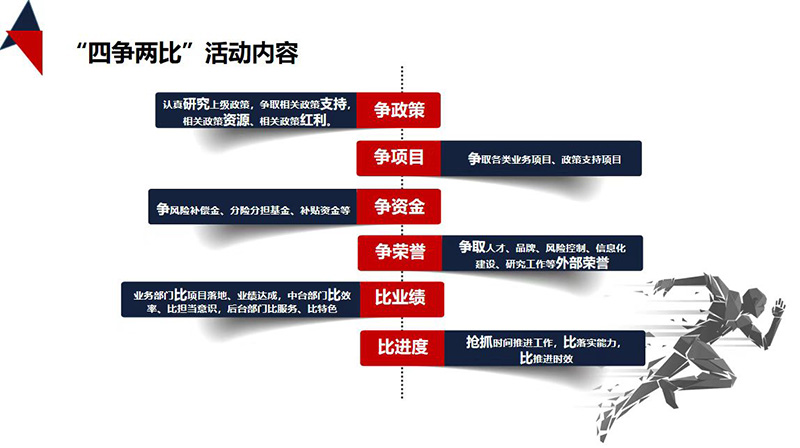 西部擔(dān)保以“改進作風(fēng) 提升質(zhì)效”專項行動為契機,圍繞“嚴(yán)細(xì)深實勤儉廉+快”作風(fēng)要求,同時結(jié)合市委下發(fā)的關(guān)于《銀川市2022年項目突破年活動實施方案》,2022年公司推行了“四爭兩比”活動,激勵全體員工在“爭”中提振擔(dān)當(dāng)作為、干事創(chuàng)新的精氣神,在“比”中營造不甘人后、比學(xué)趕超的氛圍,為完成公司全年目標(biāo)任務(wù)提供堅強保障。